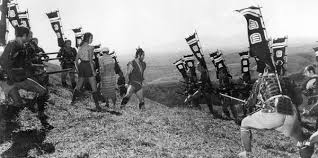 Du très grand spectacle picaresque comme je l'aime! Les deux paysans occupent le devant de la scène pendant une bonne partie du film, et voir "par en bas", à travers leurs yeux, tous ces grands seigneurs et ces guerres de clan a quelque chose de très rafraîchissant. Le personnage de la jeune princesse 'tomboy' (comme on dit en Amérique pour 'garçon manqué') est tout à fait croquignolet. Le décor pierreux et escarpé de la fameuse forteresse est formidable. Grandes scènes de foule, notamment la fête du feu qui nous procure un intermède musical de bonne venue. Bien sûr, Toshirô Mifune en fidèle samouraï-général domine aisément la distribution et les scènes d'action sont au rendez-vous, avec au programme un sacré combat de lances, une poursuite à cheval échevelée. Mais l'humour garde toujours ses droits et au bout du compte, ce sont vraiment les paysans qui sont les protagonistes – pour une fois ! Bref, un Kurosawa qui a un côté Monicelli… Voilà qui n'est pas pour me déplaire.